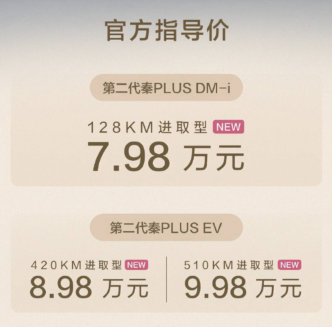 比亚迪正式推出第二代秦PLUS系列的三款新增车型:秦PLUS DM-i 128KM进取型、秦PLUS EV 420KM进取型与510KM进取型。此次上新同步推出国庆限时献礼价,全系起售价下探至6.98万元,进一步降低了高品质家轿的入手门槛。